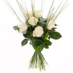 Roses à grandes fleurs arrangées avec verdure diverses. Longueur 60 cm.